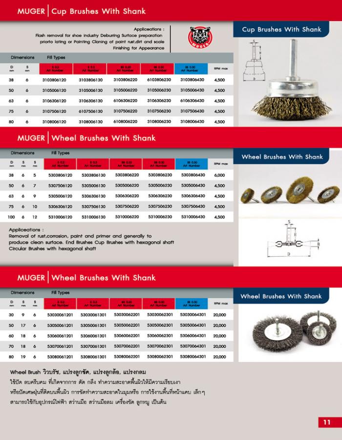 • With shank (มีก้าน)/• Without shank (ไม่มีก้าน) / With Thread (มีน๊อต) แปรงถ้วยใช้ในงานขัดลบครีบบนพื้นผิว ใช้ขัดสีลอกสี ขัดสนิม ขัดพื้นผิวให้เรียบสม่ำเสมอ ทำลายเส้น หรือ ลบครีบคมบนผิวงานได้อีกด้วย